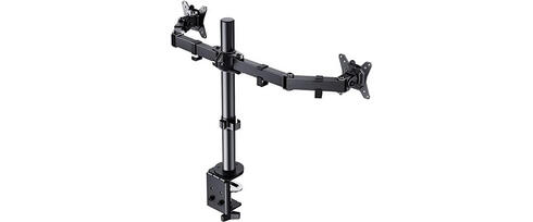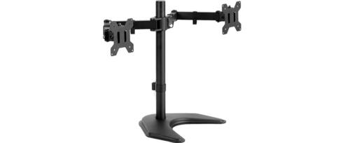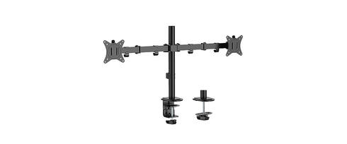 This dual monitor stand is perfect for those needing to work with two screens simultaneously. This heavy-duty stand is fully adjustable, with arms that can move in any direction to ensure maximum comfort and productivity. It can hold screens up to 27 inches, and with a VESA mount of 100x100mm, it's compatible with most monitors. The stand is made of high-grade steel, ensuring durability and stability.