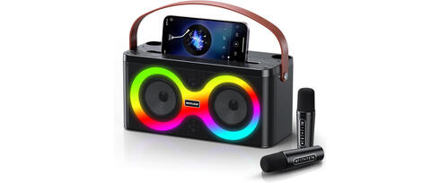 This karaoke machine is another favorite we couldn't resist, featuring dynamic lights and two wireless mics. The Bluetooth connectivity lets you connect your phone or tablet to play your favorite songs. At the same time, the rechargeable battery ensures you'll never have to worry about finding a power outlet. The machine also has a USB port and TF card slot for additional song options. Plus, the built-in voice changer and echo effect let you add your unique spin to your performances. The machine is designed for easy portability, with a handle and lightweight design, making it the perfect companion for those on-the-go karaoke sessions.